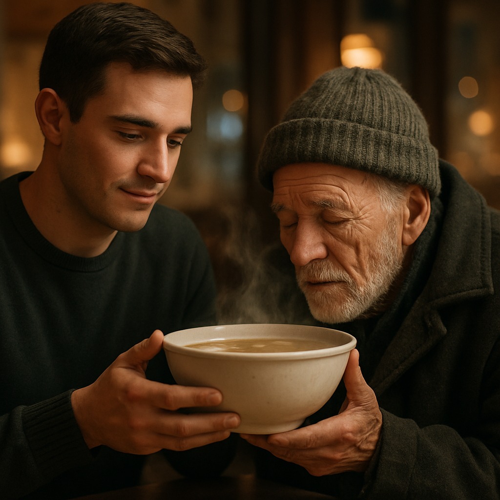 „Egy tál levest adtam egy idős férfinak az ételudvarban — néhány nappal később megjelent az ügyvédje, és örökre megváltoztatta az életemet.”